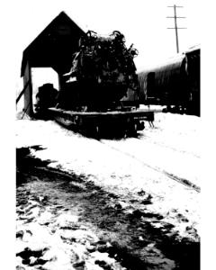 Accession: 1980.081.015 Object: photograph : b&w Title: Wrecked Locomotive at Cranbrook Description: Wrecked locomotive loaded onto rail car. Size: 9 x 13 cm Location: 1-2-4-64 Indexed In: Railroad » Accident » Fassifern