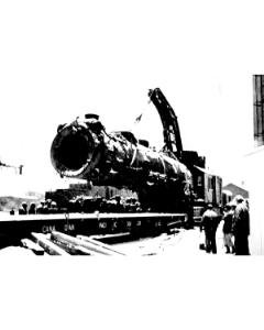 Accession: 1980.081.017 Object: photograph : b&w Title: Wrecked Locomotive, Cranbrook, BC Description: Workers watching locomotive being placed on railcar.