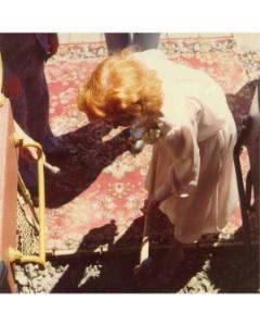 Accession: 1980.082.003 Object: photograph : col. Title: Official Opening, Cranbrook Railway Museum, Cranbrook, BC Description: Hon Grace McCarthy drives last spike