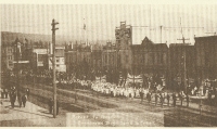Accession: 1982.038.003 Object: textual record : notecard B&W Title: Picturesque Cranbrook Description: Parade on Baker Street - 1914, Parades on the main street always were, (and still are) popular with Cranbrook citizens, whatever the occasion. In this picture "Cranbrook Boys" are being saluted as they march towards the Railway Station to trains taking them off to serve in World War 1. & 1 copy with envelope Size: 8 x 14 cm Publisher: Cranbrook Archives, Museum & Landmark Foundation Location: 1-2-5-38 Indexed In: Cranbrook » Military