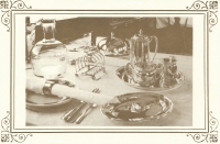 Accession: 1982.039.003 Object: textual record : postcard B&W Title: 'Argyle' table setting Description: A rich table display setting in the dining-car "Argyle" at the Railway Museum. All items are authentic Canadian Pacific Railway dining-car service of china, glass and silverware. & 1 copy Size: 13 x 19 cm Publisher: Cranbrook Archives, Museum & Landmark Foundation Location: 1-2-5-42 Indexed In: Railroad » Equipment » Silverware