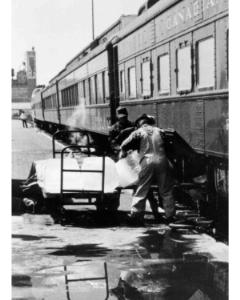 Accession: 1982.082.001 Object: PHOTO Title: CPR Sleeper Car Description: Sleeper 'Renown' being iced (1950's) B & W Size: 3 1/2' x 3 1/2' Location: 1-2-6-71 Indexed In: Railroad » Rolling Stock » Passenger » Sleeper » Renown