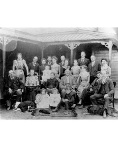 Accession: 1983.018.001 Object: photograph : b&w Title: Leask Family Description: Leask family (complete with names) on their porch (1900)