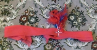 Accession: 1986.051.002 Object: clothing : female, ???, headband Title: Headband Description: Red silk with attached feathered sequined broach Location: Rutherglen Indexed In: Cranbrook » Personalities » Letter R » Roberts, Julie
