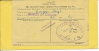Accession: 1987.003.006 Object: IMMIGRATION IDENTIFICATION CARD Title: Travel the World Description: Beryl Briggs (1949)