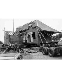 Accession: 1987.029.018 Object: photograph : b&w Title: Cranbrook, B.C. Description: Station at Elko, being moved off old foundation