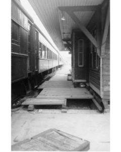 Accession: 1987.029.068 Object: photograph : b&w Title: Cranbrook, B.C. Description: Temporary platform placed between cars & station