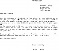 Accession: 1987.055.002 Object: TRANSCRIPT Title: Olive Baker Correspondence Description: Of letter from Olive Baker to Ted Fiedler (Mar/83)