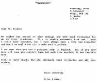 Accession: 1987.055.024 Object: TRANSCRIPT Title: Olive Baker Correspondence Description: Of letter from Olive Baker to Ted Fiedler (1987)