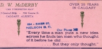 Item Date: 193? - 195? Size: 16 x 9 cm Creator: DW McDerby "The Typewriter Man" Location: 1-4-4-3 Indexed In: Cities » Alberta » Calgary » Business » D W McDerby