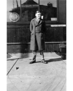 Accession: 1990.091.027 Object: Photo : b & w Title: Olive Chivers Collection Description: Bill Taylor in front of Telegraph Office