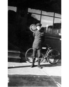 Accession: 1990.091.030 Object: photograph : b&w Title: Olive Chivers Collection Description: Mac Horie in front of Telegraph Office
