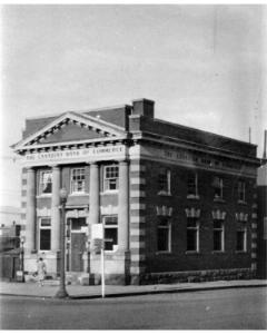 Accession: 1992.019.001 Object: Photograph : b&w Title: Canadian Bank of Commerce Description: Building was located on the corner 10th Avenue and Baker Street Size: 4" x 6" Location: 1-3-2-22 Indexed In: Cranbrook » Building » Bank » Commerce