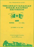 Accession: 1992.058.001 Object: textual record : booklet Title: 'The Great Canadian Steam Railway Excursion' Description: The Royal Hudson Steam Train Society and Rocky Mountain Rail Society Item Date: ca 1988 Size: 28 x 22 cm Location: PF.0189.0006 Indexed In: Railroad » Rolling Stock » Passenger » Train » GCSRE