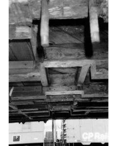 Accession: 1992.165.270 Object: Photograph : b&w Title: Restoration Process Description: Notching under beams for new steel supports
