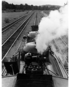 Accession: 1993.010.002 Object: Photograph : b&w Title: Adolf Hungry Wolf Description: View from cab roof #3716 on #2 Track, Fort Steele