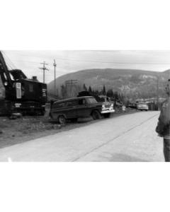 Accession: 1995.002.001 Object: Photograph : b&w Title: Canadian Pacific Railway Ltd Description: CPR wreck at Bonnington Falls - Crane & panel truck