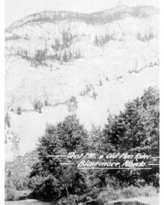 Accession: 1997.020.015 Object: Photograph : b&w Title: Local History Description: Tent Mt & Old Man River, Blairmore Alberta' Size: 7 x 9 cm Location: 1-3-4-14 Indexed In: Physical Features » Mountain