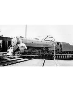Accession: 1997.021.762 Object: Photograph : b&w Title: Canadian Pacific Railway Description: CPR loco #5928 on turntable at Revelstoke BC Item Date: ca 1949 Size: 20 x 25 cm Photographer: Jim Hope Location: 1-3-4-15 Indexed In: Railroad » Building » Roundhouse