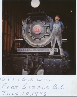 Accession: 1998.016.004 Object: Photograph : col Title: Canadian Pacific Railway Description: G B Will & loco #1077 Item Date: ca 1993 Size: 10.5 x 9 cm Location: 1-3-4-17 Indexed In: Cranbrook » Personalities » Letter W » Will, Grant Bruce