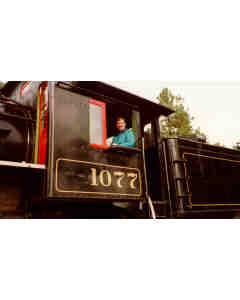 Accession: 1998.046.001 Object: photograph : col Title: Fort Steele Description: Martin Ross in cab of loco #1077 at Fort Steele Historic Park Location: 1-3-6-2 Indexed In: Cranbrook » Personalities » Letter R » Ross, Martin