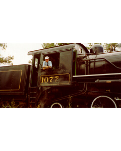 Accession: 2000.026.002 Object: photograph : col Title: Fort Steele Description: Loco #1077 & Grant B Will Item Date: 2000 Location: 1-3-6-10 Indexed In: Cranbrook » Personalities » Letter W » Will, Grant Bruce