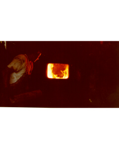 Accession: 2000.027.004 Object: photograph : col Title: Fort Steele Description: Loco #1077 firebox with Grant B Will (as fireman) Item Date: 2000 Location: 1-3-6-10 Indexed In: Cranbrook » Personalities » Letter W » Will, Grant Bruce