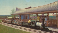 Accession: 2004.006.648 Object: Postcard : col Title: John Poulsen Collection Description: Railway Station and steam locomotive train at the Children's Zoo, Storyland Valley, Edmonton, Ab.