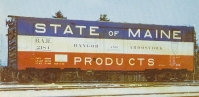 Accession: 2004.006.650 Object: Postcard : col Title: John Poulsen Collection Description: Boxcar, B.A.R. 2181, The State of Maine, bright colours make the cars stand out. Size: 9 x 13 cm Location: PHOTO.0150.0121 Indexed In: Railroad » Rolling Stock » Freight » Boxcar