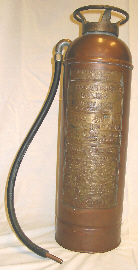 Accession: 2006.027.002 Object: fire extinguisher Title: Canadian Pacific Railway Fire Extinguisher Description: 2.5 Gal. loose stopple type. No. A 603743. Underwriters Laboratories inspected. Round copper tank, brass fixtures. 58 cm rubber hose with brass end (no valve). Embossed identification and instruction plate (15 x 33 cm) soldiered to tank. Size: 61cm high, 18 cm dia Location: Display Case #3 Indexed In: Railroad » Equipment » Fire Extinguisher