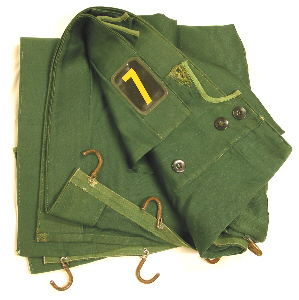 Accession: 2006.041.002 Object: textile : curtain Title: BERTH CURTAIN Description: From the CPR Shannonville 12 in 1 sleeping car from "S" series built in 1930-31. Heavy dark emerald green wool, with large button attachments. 10 metal hooks with leather sleeves. Plastic label "7". Stenciled "Shannonville" in yellow on upper edge. Size: 6 Location: Collection Indexed In: Railroad » Equipment » Bed