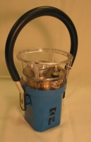 Accession: 2007.015.003 Object: artifact : lamp Title: CP Rail Trainman's Battery Lamp Description: Starlite 292, Star Headlight & Lantern. Blue plastic body with clear plastic protective ring. 3 bulbs (1 with reflecting dish). rubber coated aluminum handle. 3 way switch. CP Rail logo printed on body. (no battery) Size: 28 cm height Creator: Star Headlight & Lantern Co., Honeoye Falls, NY, USA Location: 3-Dimensional Indexed In: Railroad » Equipment » Lamp