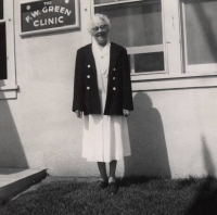 Accession: 2008.001.006 Object: photograph : b&w Title: Winnifred Mary Patton Description: Winnifred Mary Patton in front of the old F. W. Green Clinic, Cranbrook, BC where she worked for many years. Size: 9 x 9 cm Location: 1-4-1-35 Indexed In: Cranbrook » Personalities » Letter P » Patton, Winnifred