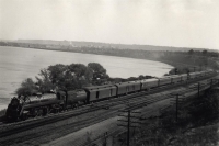 Accession: 2008.044.007 Object: photograph : b&w Title: Canadian National Railway (CNR) Passenger Train with Locomotive # 6071 at Hamilton Junction, Ontario Description: Handwritten note on back stating "C.N 6071 Hamilton Jtn. Ont. Inter City Ltd. Sept. 12, 1948." Train pulling various passenger cars, lake and city in background. Item Date: Sept. 12, 1948 Size: 17.5 x 15.5 cm Location: 1-4-1-47 Indexed In: Railroad » View