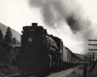 Accession: 2008.044.013 Object: photograph : b&w Title: Canadian Pacific Railway (CPR) Train with Locomotive # 5314 Between Spences Bridge and Lytton, BC Description: Handwritten note on back stating "C.P. 5314 Eastbound between Lytton and Spences Bridge Aug. 31/47." Head-on view Item Date: Aug. 31, 1947 Size: 20.5 x 25.5 cm Location: 1-4-1-47 Indexed In: Cities » British Columbia » Outside the Kootenays » Spence's Bridge » View