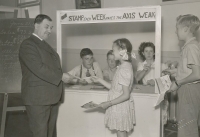 Accession: 2009.007.014 Object: photograph: b&w Title: A. J. Balment Description: Balment in "Drive for Stamps" Item Date: 1940 Size: 13 x 18 cm Location: 1-4-2-7 Indexed In: Cranbrook » Personalities » Letter B » Balment, Al