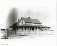 Accession: 2009.030.158 Object: photograph : b&w Title: Our Home Description: Home with veranda on two side of home, screened back porch, picket fence Size: 20.2 x 25.2 cm Location: 1-4-8-3 Indexed In: Cranbrook » Building » Residence