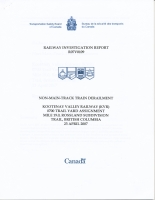 Accession: 2012.015.001 Object: textual record : report Title: Railway Investigation Report R07V0109, Non-Main-Track Train Derailment Description: Railway Investigation Report R07V0109, Non-Main-Track Train Derailment, Kootenay Valley Railway (KVR) 0700 Trail Yard Assignment Mile 19.0 Rossland Subdivision Trail, British Columbia, 23 April, 2007, Uncontrolled train, 1 fatality. Item Date: Apr 23, 2007 Size: 21.5 x 28 cm Pages: 19 Author: Transportation Safety Board of Canada Creator: Transportation Safety Board of Canada Publisher: Transportation Safety Board of Canada Location: 2-2-4-20 Indexed In: Railroad » Company » CP Rail