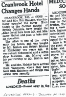 Accession: 2012.023.002 Object: textual record : photocopy Title: Cranbrook Hotel Changes Hands Description: Photocopied newspaper article regarding the sale of the Allan Hotel to Mr & Mrs Eric Halskov from Mr & Mrs Larry Melton. Item Date: January 24, 1949 Size: 21 x 28.5 cm Publisher: Lethbridge Herald Location: 1-5-8-25 Indexed In: Cranbrook » Building » Hotel