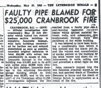 Accession: 2012.023.003 Object: textual record : photocopy Title: Faulty Pipe Blamed for $25,000 Cranbrook Fire Description: Photocopied newspaper article regarding the fire in the Allan Hotel which completely destroyed the building, and caused considerable damage to the adjoining two-storey garage building. Two fatalities in the fire were identified as Theodore Swanson and George Satich. Item Date: Wednesday, May 27,1952? Size: 21 x 28.5 cm Pages: 1 Publisher: Lethbridge Herald Location: 1-5-8-25 Indexed In: Cranbrook » Building » Hotel