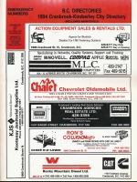 Accession: 2012.027.028 Object: textual record : directory, printed Title: B.C. Directories - Cranbrook - Kimberley City Directory (Including Marysville) Business Edition Description: B.C. Directories - Cranbrook - Kimberley City Directory (Including Marysville), Business Edition. Four Directories in one Volume: Classified Business, Alphabetical, Street Address, Numerical Telephone. From Frank (retired Cranbrook Fire Chief) & Delphine (owner of Colene's Dress Shoppe) Colonna's collection. Item Date: 1994 Size: 22 x 29 x 1 cm Pages: 178 Publisher: Polk Canada Ltd. Location: Library - Reference Indexed In: Cities » British Columbia » East Kootenay » Kimberley