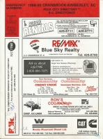 Accession: 2012.027.029 Object: textual record : directory, printed Title: B.C. Directories - Cranbrook - Kimberley City Directory (Including Marysville) Home Edition Description: B.C. Directories - Cranbrook - Kimberley City Directory (Including Marysville), Home Edition. Two Directories in one Volume: Classified Business, Alphabetical. From Frank (retired Cranbrook Fire Chief) & Delphine (owner of Colene's Dress Shoppe) Colonna's collection. Item Date: 1998/1999 Size: 22 x 29.5 x 1 cm Pages: 168 Publisher: Polk Canada Ltd. Location: Library - Reference Indexed In: Cities » British Columbia » East Kootenay » Kimberley