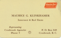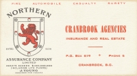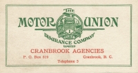 Accession: 2012.035.057 Object: textual record : card Title: Cranbrook Agencies Business Cards Description: Cranbrook Agencies Business Cards, various including: The Motor Union Insurance Company, Northern Assurance Company Limited, Union Assurance Society Limited (2 but with different information on each), The North West Fire Insurance Co., North British & Mercantile Insurance Company Limited, Maurice G. Klinkhamer - Insurance & Real Estate (1953 with 1954 calendar on back) Item Date: Unknown Size: 16 x 9 cm each (1 is 9 x 5.5 cm) Pages: 7 Author: Cranbrook Agencies Creator: Unknown Publisher: Unknown Location: 4-2-5-47 Indexed In: Cranbrook » Business