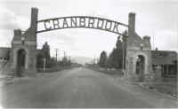 Two fieldstone arches once spanned the highway through Cranbrook at the East and West City limits. This, the eastern arch, was located at the intersection of 4th St N and Cranbrook St. They were built during 1930 at the initiation of the Board of Trade with the idea of providing relief labour. They were designed by Col. D. W. Philpot, City Engineer, and became a great tourist attraction. They were torn down in 1957 when the highway was widened. This photo shows the tower still on the Central Public School (1909), which was later removed. John and Pheme Parkin lived on Cranbrook Street in the block between the school and the arch. |