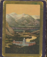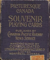 Complete deck of vintage playing cards, souvenir deck is from the Canadian Pacific Railway. Each card shows scenic photos of Canada. and published by Canadian Pacific Railway News Service. Made by Consolidated Lithographing & Manufacturing Co., Limited Montreal, Canada. Outer box and base of inner box has cancelled tax stamp from C. L. M. Co. Deck includes all four sets of suits, one joker, card listing the photos on each card by suit and a CPR News Service Price $1.00. Back of cards and box has coloured picture of Banff Hotel and Mt Rundle, Banff, Alberta. Condition of outer box has wear on edges, inner box in great shape. Cards show normal age use while joker has two horizontal folds, but still in good shape. |