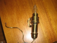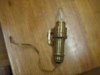 Accession: 2017.003.001 Object: Artifact : lights Title: Railroad Caboose Lamps Description: Adam Westlake caboose lamp lantern railroad wall mount, brass. Electric wire attached and stamped "THE SAFETY CO NEW YORK." Cylindrical in shape with handle-shaped bracket welded in place to slide into wall bracket. Candelabra light bulb included. Bulb is Sylvania 25 w, 125 v Korea, clear 9.5 cm. Item Date: unknown Size: 18 x 8 x 7 cm without bulb Creator: The Safety Co., New York Indexed In: Railroad » Equipment » Lamp
